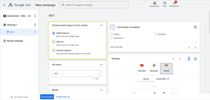 همان طور که گفتیم ساخت تبلیغ جیمیلی فقط از مسیر «Demand Gen» امکانپذیر است. با این کمپین گوگل ادز، تبلیغات جیمیل، یوتیوب و گوگل دیسکاور را همزمان میتوانید ایجاد کنید (منبع: NestScale).
