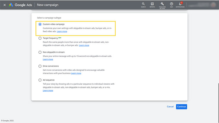 پیشنهاد ما این است که از بین گزینههای موجود، اولی، یعنی Custom video campaign را انتخاب کنید. با این کار، میتوانید از تمام فرمتها با توجه به هدف خود استفاده کنید.