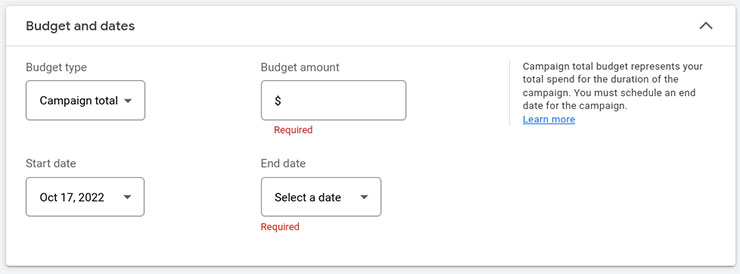 در این بخش، بودجهای را که برای کل کمپین مدنظر دارید، وارد میکنید. فقط در نظر داشته باشید که باید مدتزمان کمپین را مشخص کنید. بودجهای که معلوم میکنید هم مربوط به همان زمان مشخص شده است.