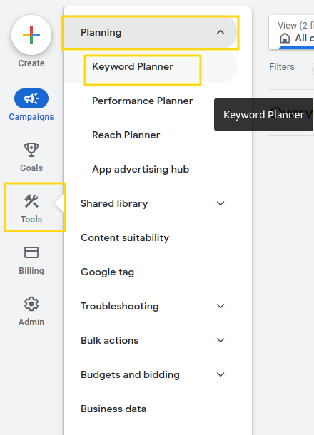 برای دسترسی به ابزار گوگل کیورد پلنر باید روی گزینهٔ «Tools & Settings» در بالای پنل کلیک کنید تا یک منوی کشویی باز شود و سپس گزینهٔ «Keyword Planner» را در بخش «PLANNING» انتخاب کنید.