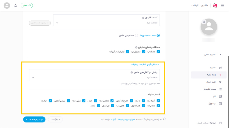 توجه: در قسمت «تنظیمات پیشرفته»، این فرصت به شما داده میشود که تعیین کنید مشترکین کدام اپراتورهای اینترنتی آگهی را ببینند؛ همچنین اگر میخواهید تبلیغ فقط در کانالهای خاص منتشر شود، نام آن را در این بخش وارد کنید.