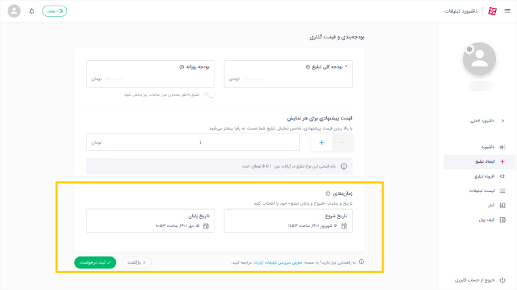 مرحلهٔ هشتم: وقتی همۀ این مراحل طی شد، تبلیغ شما آمادۀ انتشار خواهد بود. شما باید تاریخ و ساعت شروع و پایان نمایش تبلیغات را مشخص کنید و سپس روی ثبت درخواست کلیک کنید.