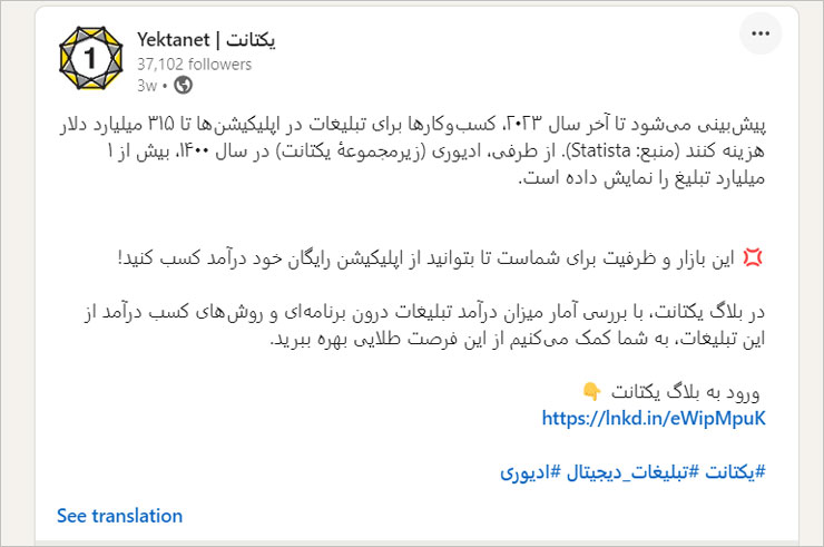 برای نمونه، این پست از اینستاگرام یکتانت، بازیافت مقالهٔ «بهترین روشهای تبلیغ برای دندانپزشکی» است: