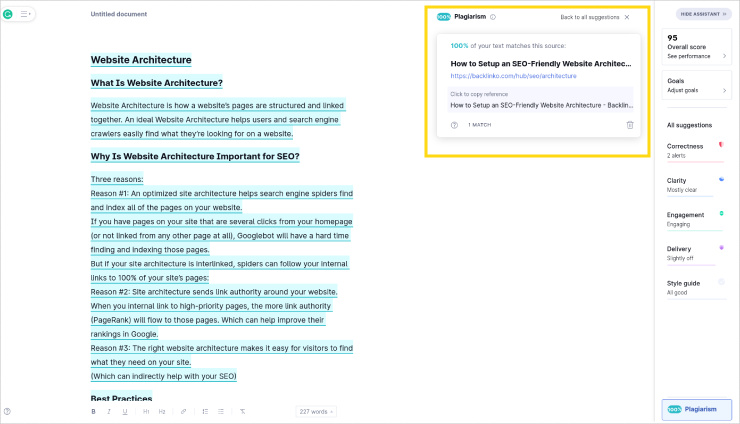 ما بخشی از یکی از مقالههای Backlinko را با گرامرلی چک کردیم. همان طور که مشاهده میکنید، این ابزار بهخوبی کپیبودن این متن را تشخیص داده است: