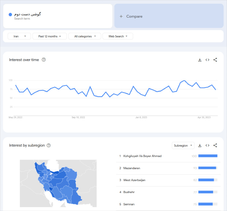 آمار گوگل ترندز هم نشان میدهد که حجم جستوجو عباراتی مثل «گوشی دستدوم» در استانهایی مثل کهگیلویه و بویراحمد، مازندران و… بهشدت بالاست.