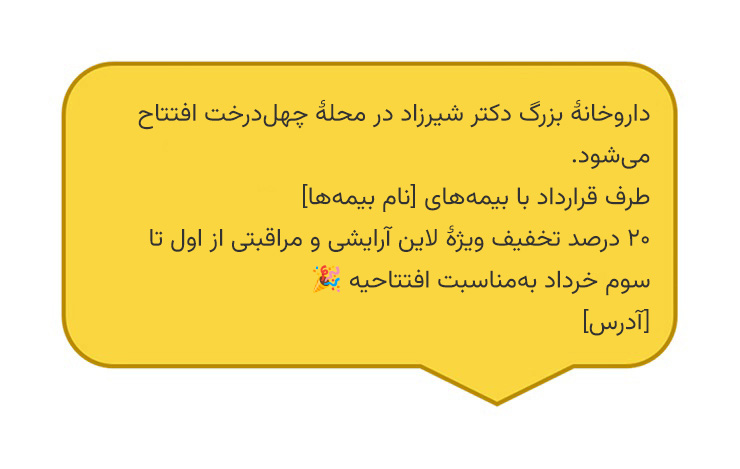 اول اینکه پیامک با اشاره به موقعیت مکانی داروخانه شروع میشود تا خیلی زود توجه اهالی منطقه را جلب کند. در ادامه، مزیت داروخانه که قرارداد با بیمههای مختلف است، ذکر میشود و آخر پیشنهاد ویژهٔ افتتاحیه، بهانهٔ خوبی برای بازکردن پای اهالی به داروخانه به آنها میدهد.