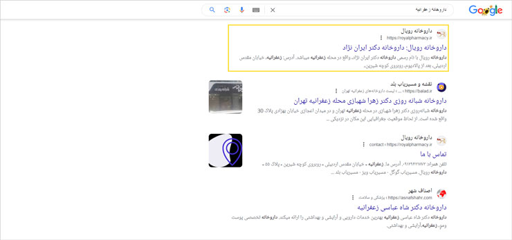 اگر داروخانهٔ آنلاین شما شعبهٔ فیزیکی هم دارد، به لیست فعالیتهای خود سئوی محلی (Local SEO) را هم اضافه کنید. سئوی محلی یعنی سایت شما در نتایج جستوجوهای محلی دیده شود؛ مثلاً وقتی کسی عبارت «داروخانهٔ زعفرانیه» را جستوجو میکند، به سایت داروخانهٔ رویال در زعفرانیه میرسد: