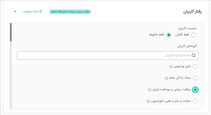 در این بخش میتوانید کاربران را بر اساس جنسیت و رفتاری که در اینترنت از خود نشان دادهاند، هدف بگیرید؛ مثلاً کاربران خانمی را که به محتواهای مراقبت زیبایی و بهداشت فردی علاقهمند هستند، هدف تبلیغات خود برای محصولات مراقبتی قرار دهید.