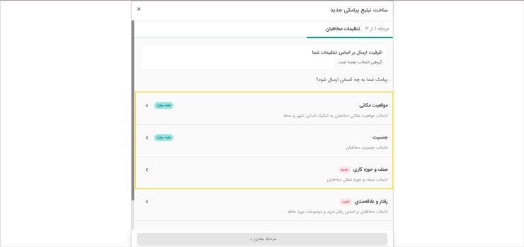 حالا اگر محصولی داشتید که مخاطب آن خانمها یا آقایان بهتنهایی بودند، میتوانید پس از موقعیت مکانی، جنسیت مخاطبان را هم انتخاب کنید. حتی این امکان وجود دارد که به ویژگیهای قبلی، صنف و حوزهٔ کاری را هم اضافه کنید و برای مثال، فقط به پزشکان ساکن مناطق ۱ و ۲ تهران پیامک بفرستید.