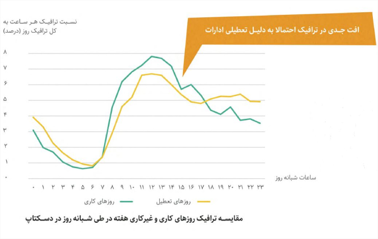 پس از پایان یافتن ساعات کار اداری، ترافیک دسکتاپ در روزهای تعطیل، از ساعت ۱۷ تا ۶ صبح از ترافیک در روزهای کاری پیشی میگیرد.
